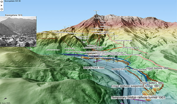 A 3D terrain model of Karangahake and infrastructure (1886 to 1933 inclusive).